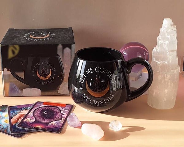 « Let me consult my crystals »,« Laisse-moi consulter mes cristaux » 🔮✨ accompagnée d’un croissant de lune et d’un motif cristallin en feuille dorée. Une déclaration pleine d’esprit pour celles et ceux qui aiment mêler intuition, rituels modernes et autodérision ☕🌙